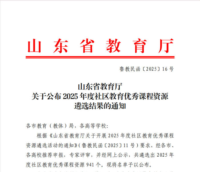 同时,山东外国语职业技术大学立足社区居民实际需求,围绕婴幼儿教育、家庭教育、青少年教育、市民教育、老年教育等社区居民普遍关注的主题,持续开发结构清晰、内容实用、便于学习的课程资源。此次16项资源成功入选,有效彰显了学校在基层公共教育和终身学习服务中的专业支撑作用。