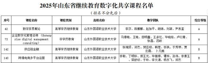 齐鲁网·闪电新闻1月7日讯 近日,省教育厅公布2025年度继续教育数字化共享课程和社区教育优秀课程资源立项结果。山东外国语职业技术大学《数字贸易概论》等4门课程获批省级继续教育数字化共享课程,《银龄巧手·艺趣人生》等16项资源入选省级社区教育优秀课程资源。