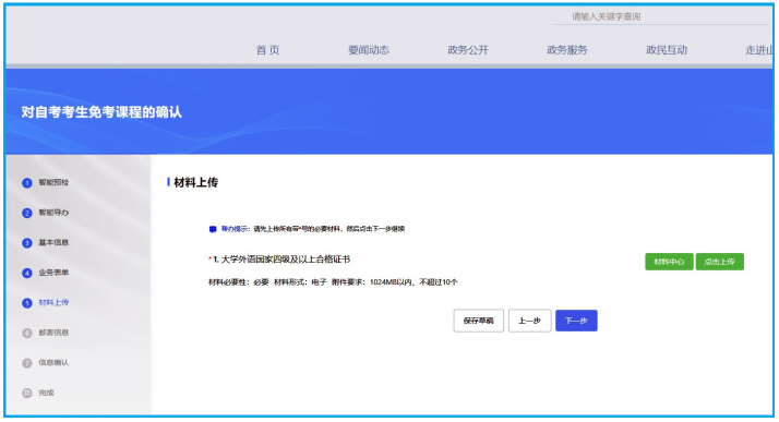 6.点击“下一步”按钮,进入材料上传页面(如下图),请点击绿色的“点击上传”按钮,按照要求上传对应的材料图片,图片格式为JPG。