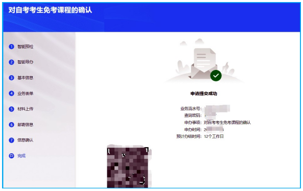 7.完成材料上传后,点击“下一步”按钮进入信息确认页面,考生检查确认后提交最终的免考申请,出现“申请提交成功”页面后(如下图),办理完成。