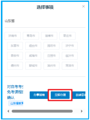 (三)点击红色标题“对自考考生免考课程的确认”,在弹出的“选择事项”页面中,点击红色框内的“立即办理”。