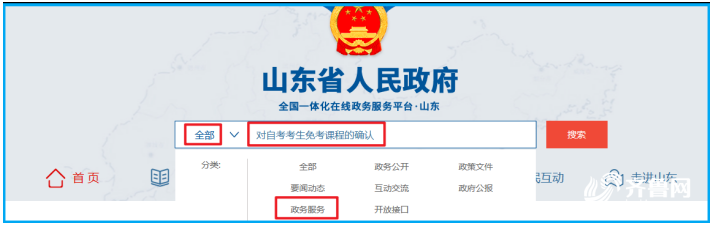 (二)在网站首页的搜索框左侧点击“全部”,从“分类”中选择“政务服务”,在文本框中输入“对自考考生免考课程的确认”,点击“搜索”后,从搜索结果中找到如下页面。