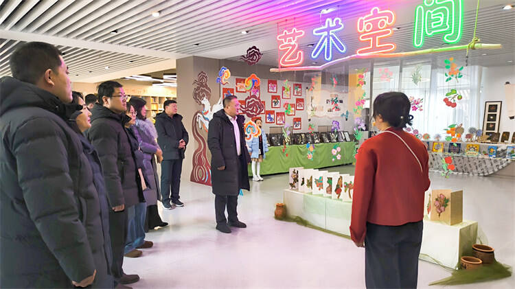 考察团参观了学校艺术空间的“非遗润校园·匠心绘花果”非遗工艺画展。展览展出了学生运用掐丝珐琅、烧箔画、锡纸錾刻等工艺创作的作品,这些作品的完成得益于家长的支持和社区资源的对接。在座谈交流环节,学校介绍了“三引导”工作的具体落实机制,重点阐述了“学生成长共同体”的组织方式、全年活动体系设计以及校社联动平台的运作模式。双方围绕共同体的组建、活动开展与评价方式进行了深入的探讨。