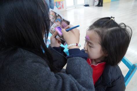 二层则围绕趵突泉主题,精心打造了画脸、糖画、漆扇、爆米花四大趣味互动摊位,将泉城地标文化与传统手工艺体验巧妙结合。画脸摊位前,学子们选用安全无毒的儿童颜料,根据孩子们的喜好,为他们勾勒出憨态可掬的卡通脸谱、灵动的生肖图案,一张张彩绘的小脸让孩子们兴奋不已;糖画摊位旁,熬煮至金黄的糖稀在学子手中翻转、拉伸、勾勒,转瞬之间,活灵活现的小兔子、荷花、趵突泉泉眼等造型便跃然石板上,凝固成香甜的糖画,孩子们拿着专属的糖画作品,脸上满是惊喜与满足;漆扇摊位里,学子们耐心指导小朋友用颜料在空白扇面上绘制趵突泉、荷花、柳树等泉城标志性元素,孩子们发挥想象力,用稚嫩的笔触创作属于自己的国风漆扇,在绘画中加深对泉城文化的认知;爆米花摊位则为整场活动增添了甜蜜的烟火气,滚烫的玉米粒在机器中爆开,香甜的气息弥漫在二层空间,香脆的爆米花让孩子们的欢声笑语更加热烈。小朋友们在各个摊位间穿梭体验,在动手实践中领略传统手工艺的精妙技艺,沉浸式感受济南趵突泉的文化底蕴。