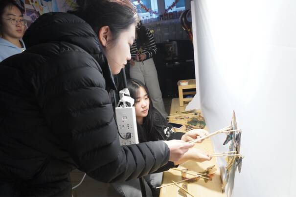 一层的皮影戏互动游园会成为孩子们驻足的焦点,学院学子提前精心制作了色彩斑斓、造型生动的皮影道具,进行了现场演绎。伴随着学子们生动的台词配音与灵活的皮影操控,一个个鲜活的角色在幕布上跃然呈现,婉转的配乐与趣味的剧情瞬间抓住了孩子们的注意力,现场不时传来阵阵欢呼与笑声。在互动体验环节,学子们化身“非遗小老师”,手把手指导小朋友们亲手操控皮影人偶,讲解皮影摆动的技巧与故事演绎的逻辑,孩子们兴致勃勃地尝试,在亲手操作中近距离感受皮影这一传统民间艺术的独特魅力,在心底种下传承传统文化的种子。